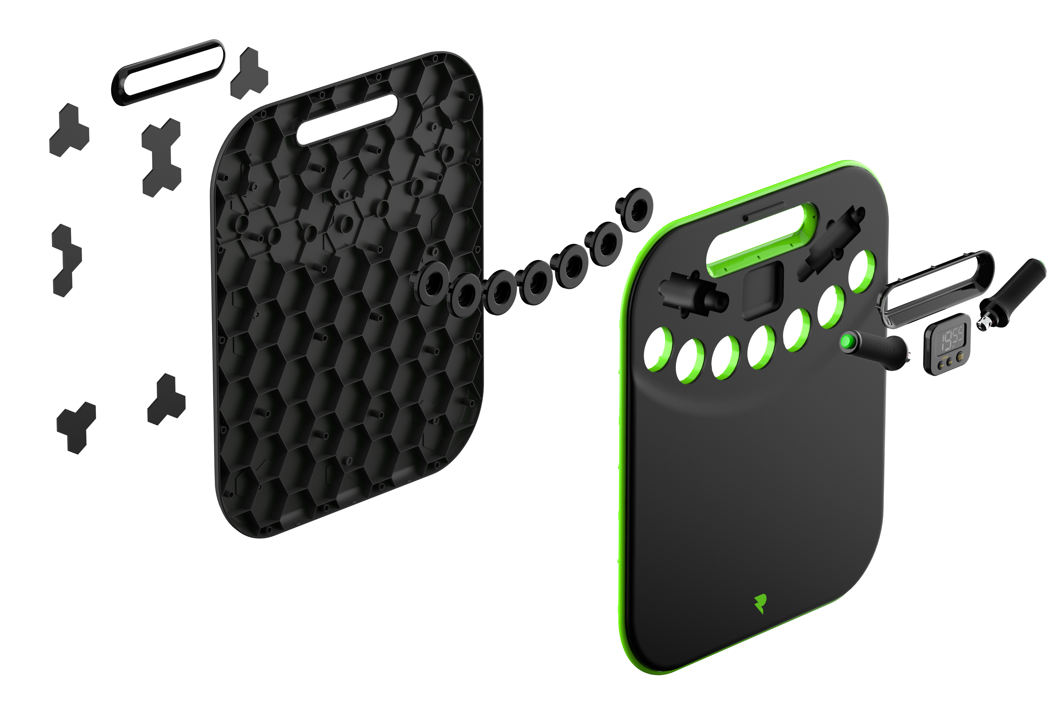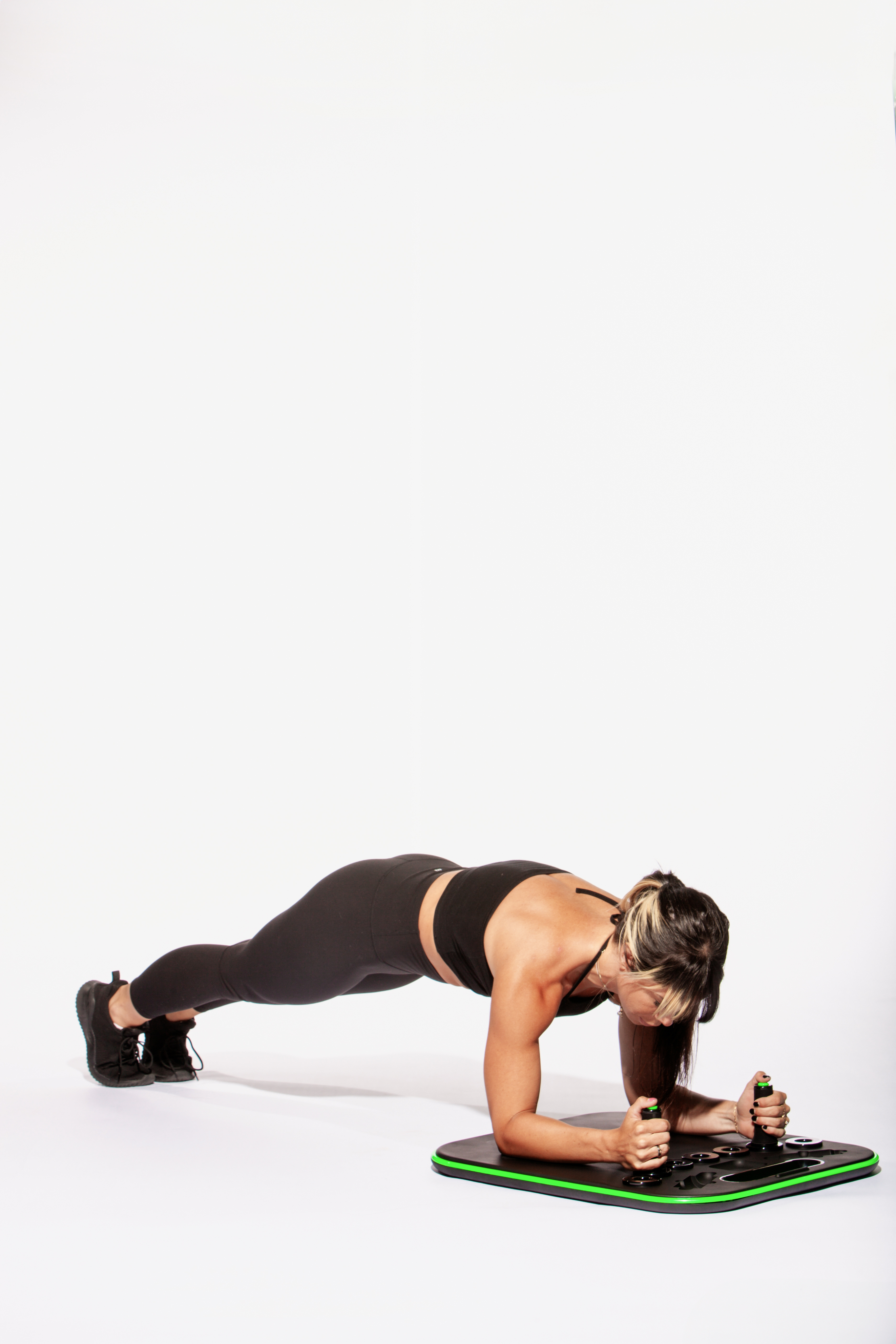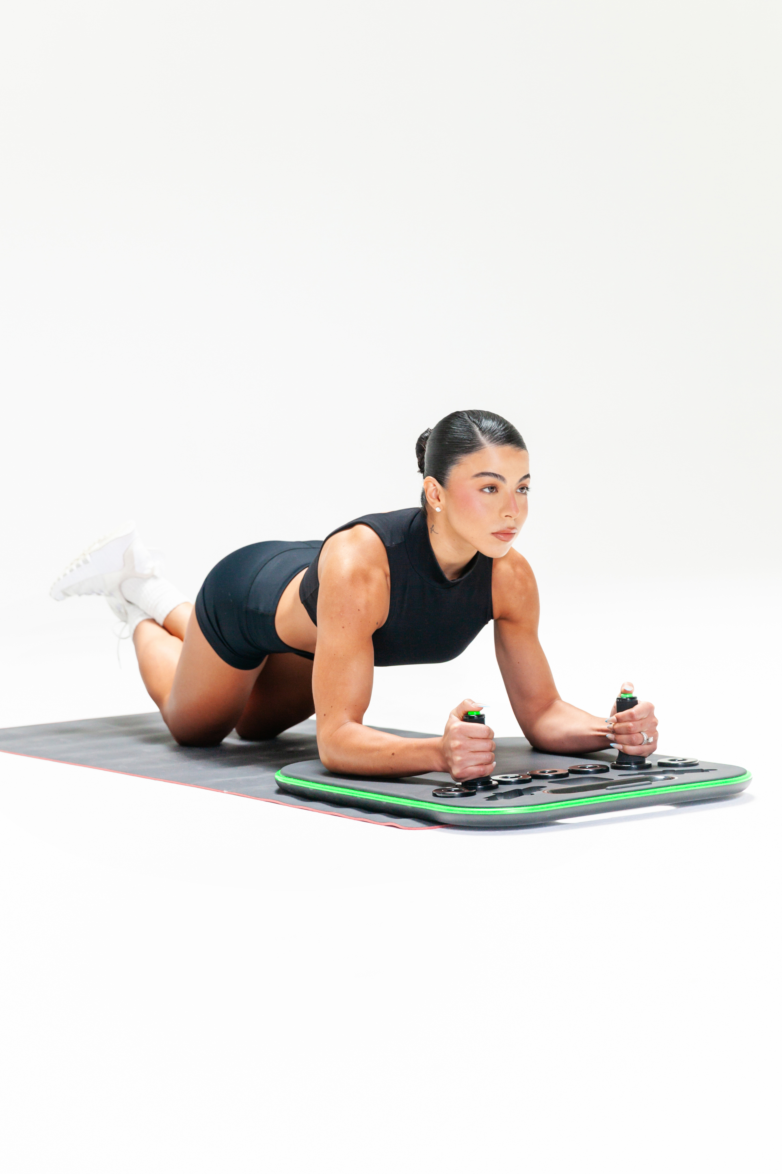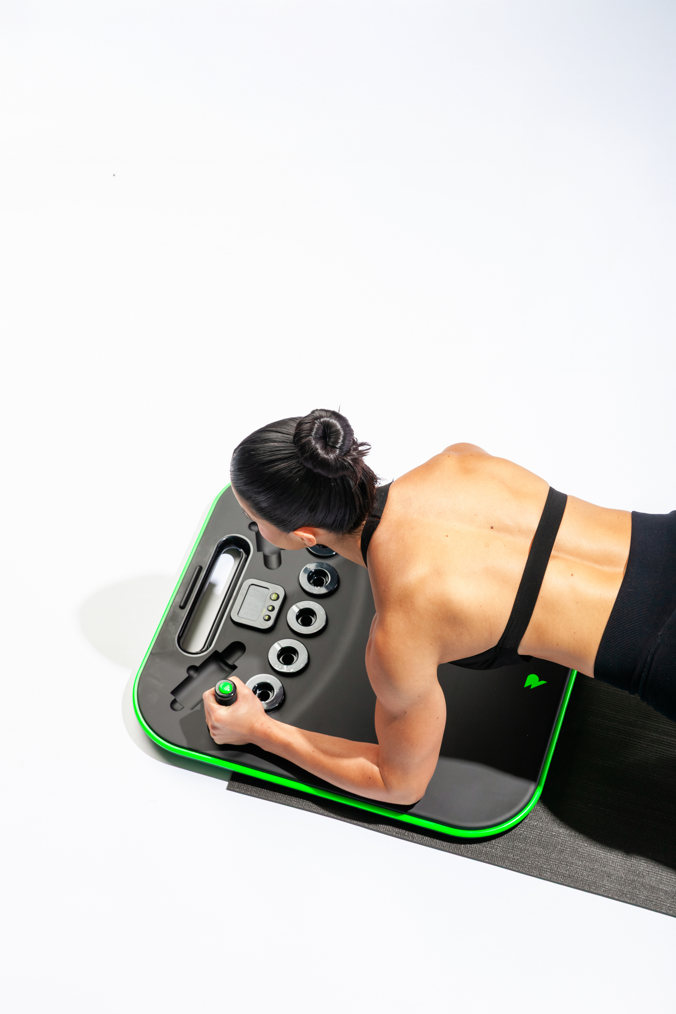 Set it down, get into position, and hold. The padding keeps you comfortable, the handles keep you stable, and the timer tracks your progress. Three minutes daily, that's it.
